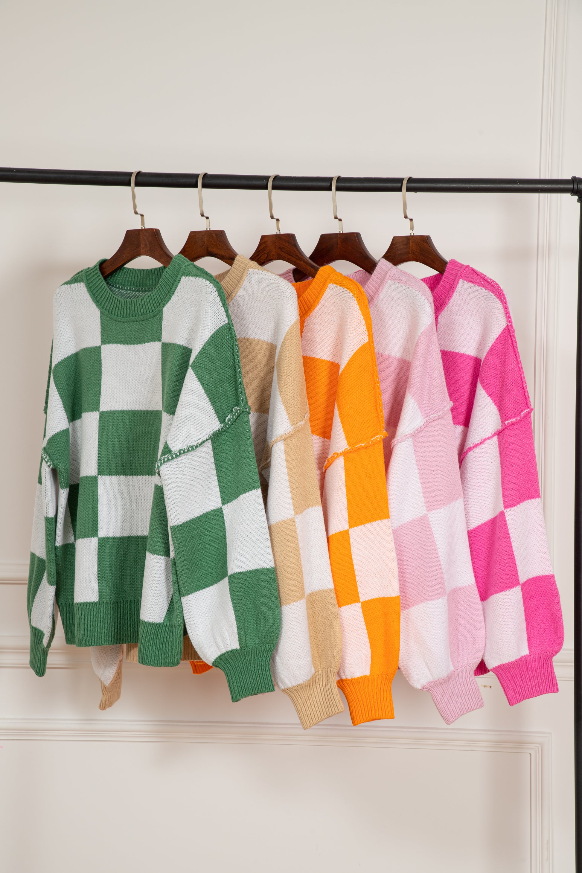 - Elevate your wardrobe with this stylish Checkered Bishop Sleeve Sweater